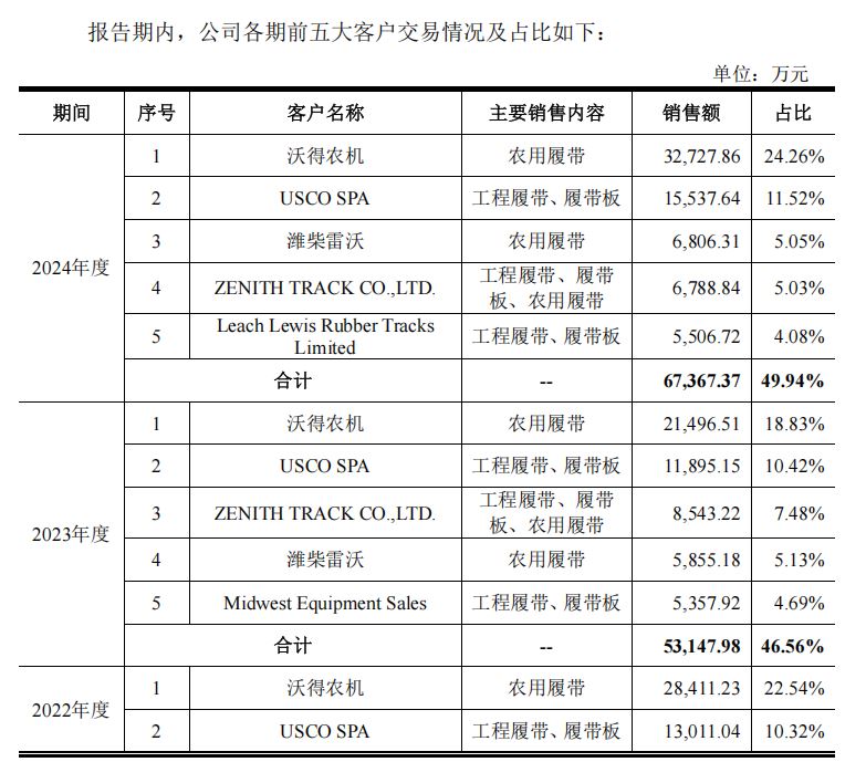 截至报告期各期末,公司对沃得农机的应收账款余额分别为8750.37万元、11735.28万元和17504.75万元,占当期应收账款余额的比例超过40%。