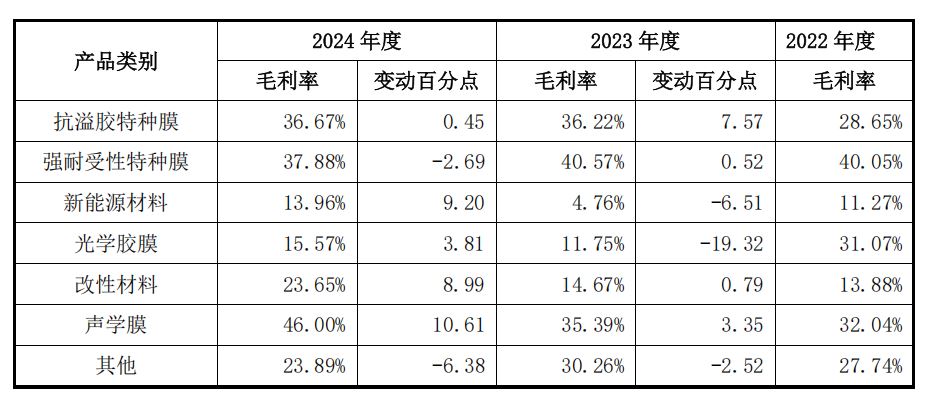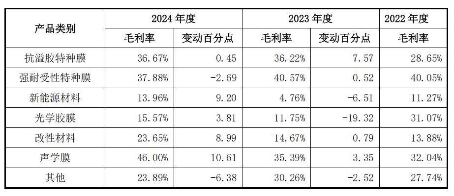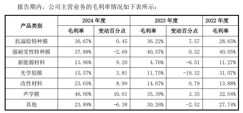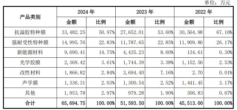 新广益正积极拓展新能源锂电材料、光学胶膜、光伏胶膜等新业务领域。报告期内,新能源材料收入增长较快,从2022年仅有0.30%的营收占比增长至2024年的14.75%。