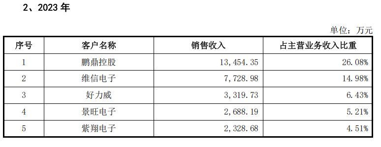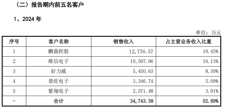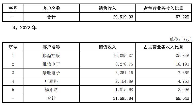 这些客户主要包括鹏鼎控股、维信电子等柔性线路板生产商。其中,鹏鼎控股始终为公司第一大客户,销售占比分别为35.34%、26.08%和19.45%。