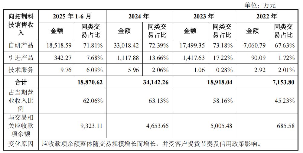销售占比畸高且持续攀升:2022年至2025年上半年,公司对拓荆科技的销售收入占营业收入的比例分别为45.23%、58.16%、63.13%和62.06%,连续两年半超过50%,且呈现上升趋势。这远超常规的客户集中度,使得公司的业绩命脉系于单一客户。