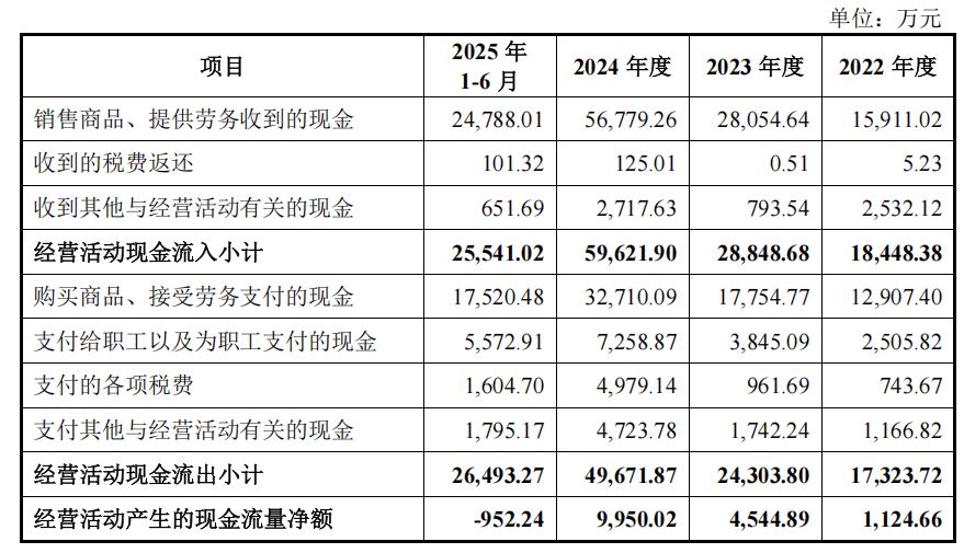 2025年上半年,在公司仍保持盈利的情况下,其经营活动产生的现金流量净额转为-952.24万元,与净利润的差额高达-7894.66万元。这种背离状况通常意味着公司利润质量不高,回款能力减弱。