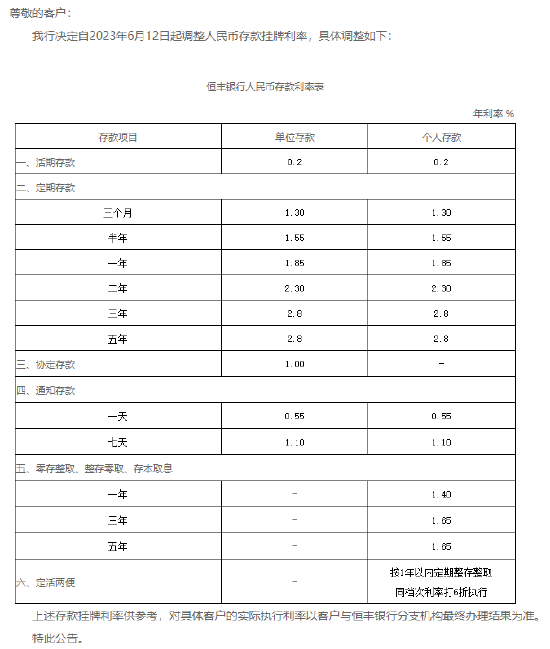 渤海银行、恒丰银行两年期、三年期和五年期人民币定期存款利率分别降至2.3%、2.8%、2.8%。