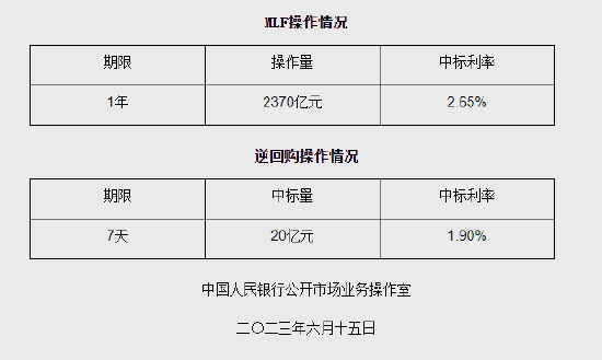 6月15日金融一线消息,中国人民银行6月15日公告称,为维护银行体系流动性合理充裕,2023年6月15日人民银行开展2370亿元中期借贷便利(MLF)操作和20亿元7天期逆回购操作,充分满足了金融机构需求。其中,MLF利率下调10个基点至2.65%,7天期逆回购利率为1.90%。