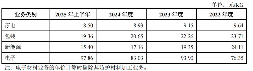 然而,这光鲜的业绩数字背后,却隐藏着明显的“以价换量”策略。三大核心业务产品单价全线下滑:家电类产品从9.64元/KG降至8.93元/KG,包装类产品从23.71元/KG降至20.65元/KG,新能源类产品价格从24.11元/KG下跌至17.16元/KG,降幅最为显著。
