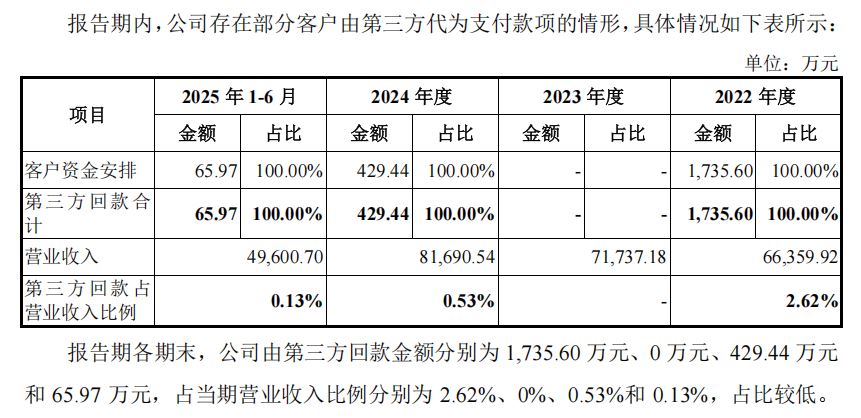 此外,2022年第三方回款金额占当期营业收入比例达2.62%,还存在通过员工个人卡代收部分货款的情形。