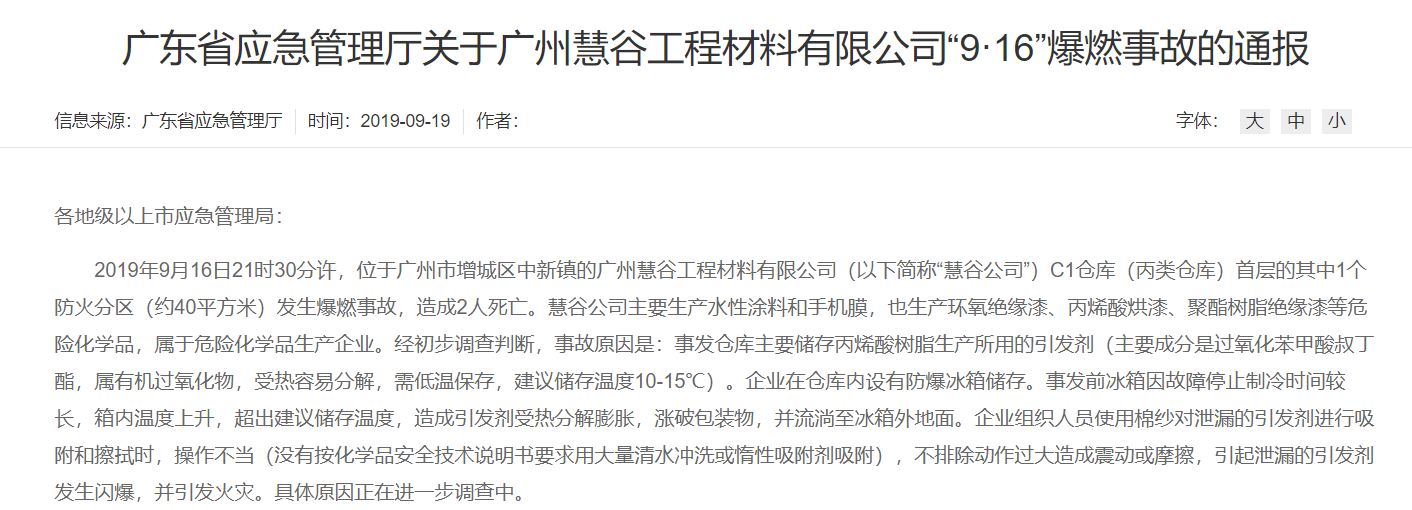 2019年9月16日,慧谷新材的全资子公司广州慧谷工程材料有限公司位于广州增城区的C1仓库发生爆燃事故,造成2名员工当场死亡。