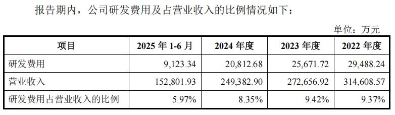 更引人注目的是,公司2025年上半年的研发费用仅为9123.34万元,研发费用率已降至5.97%,与2022年的9.37%相比大幅下降。