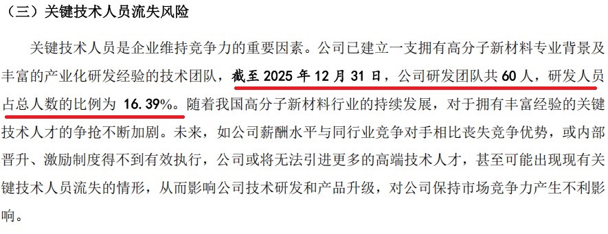 此外,作为技术密集型企业,康美特的研发团队仅60人,占总人数16.39%。随着高分子新材料行业竞争加剧,关键技术人才的争抢日趋激烈。若薪酬水平失去竞争力或激励机制失效,公司可能面临核心技术人员流失风险,进而影响产品升级与市场竞争力。