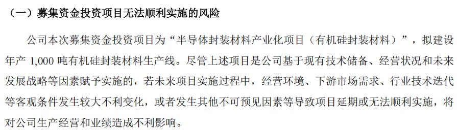 本次IPO,康美特拟募资建设年产1,000吨有机硅封装材料生产线。但招股书坦承,若下游市场需求变化、行业技术迭代或市场环境发生不利变化,项目可能无法顺利实施或效益不达预期。新增折旧、摊销费用也将对公司短期业绩形成压力。此外,发行后净资产和股本规模扩大,而募投项目实现预期利润尚需时间,即期回报存在被摊薄的风险。