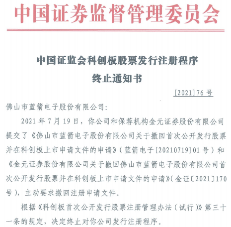 2020年12月31日,蓝箭电子过会,并于2021年3月4日提交注册。但2021年7月19日,蓝箭电子和保荐机构金元证券股份有限公司提交了《佛山市蓝箭电子股份有限公司关于撤回首次公开发行股票并在科创板上市申请文件的申请》(蓝箭电子[20210719]01号)和《金元证券股份有限公司关于撤回佛山市蓝箭电子股份有限公司首次公开发行股票并在科创板上市申请文件的申请》(金证[2021]170号),主动要求撤回注册申请文件。