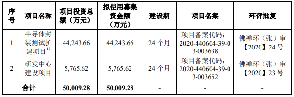 蓝箭电子原拟在上交所科创板公开发行新股不超过5000万股,且不低于本次发行后公司总股本的25%,原拟募资5亿元,拟分别用于“半导体封装测试扩建项目”、“研发中心建设项目”。