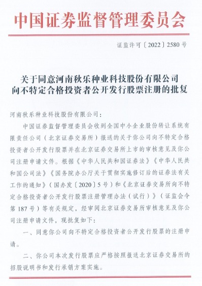 - 河南秋乐种业北交所IPO注册申请获批2022-11-01