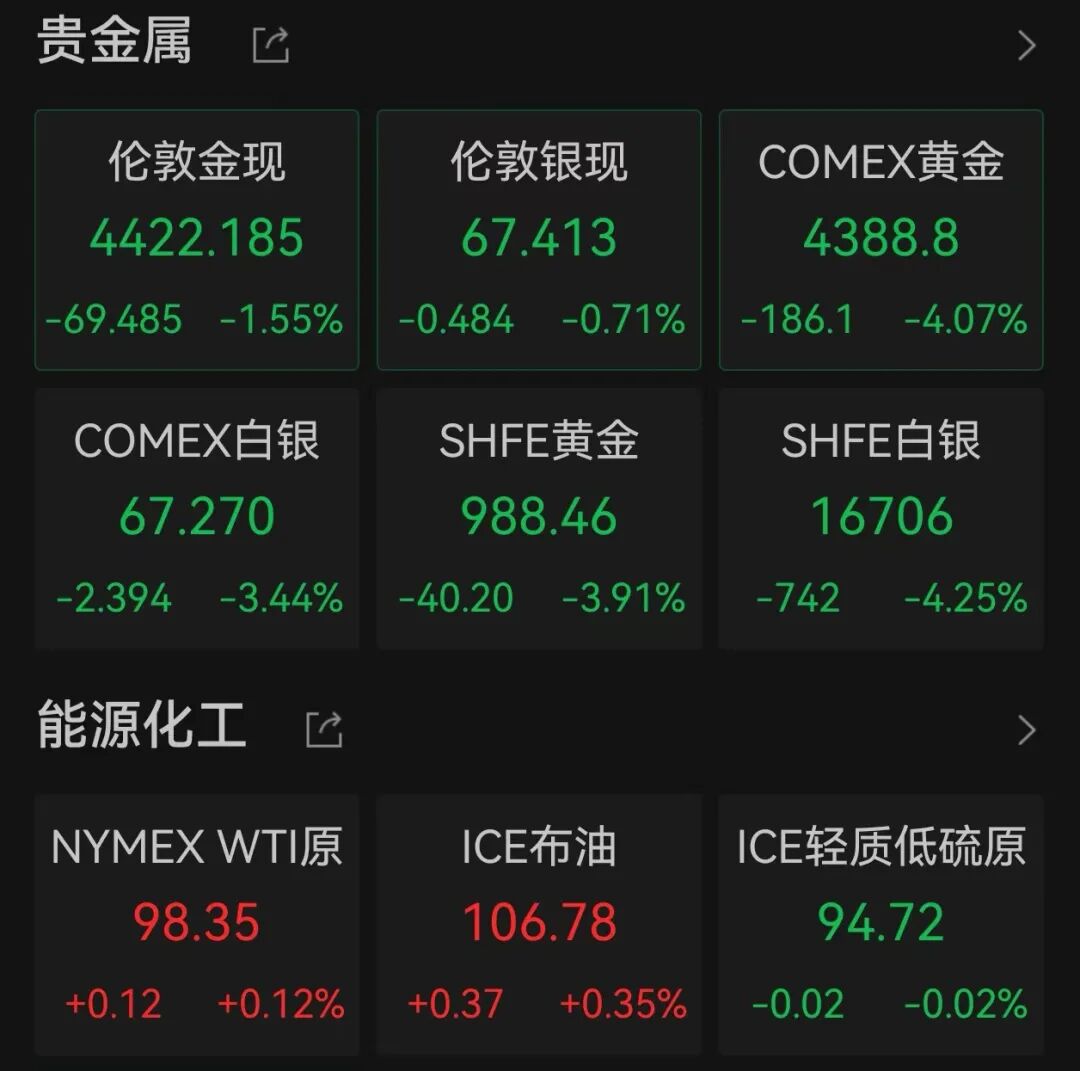 上周“央行超级周”,多国央行纷纷暂停降息,释放出强烈的观望信号,国际金价出现调整。Wind数据显示,截至北京时间3月23日9:20,COMEX黄金期货价格失守4400美元/盎司关口,跌逾4%,报4388.8美元/盎司;伦敦金现货价格跌逾1%,报4422.185美元/盎司。